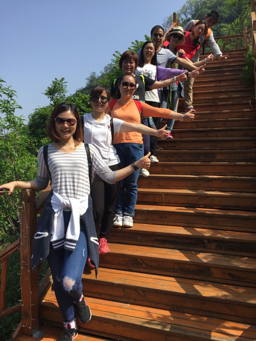 阳光明媚,生机盎然,唐王家人们一起奔向环抱着峡谷的山。木质的台阶在山间缠绕,也像是攀爬着,小伙伴们边走边聊,踏上每一级台阶,正像我们的企业一样,踏实地向前、向上迈出每一步。